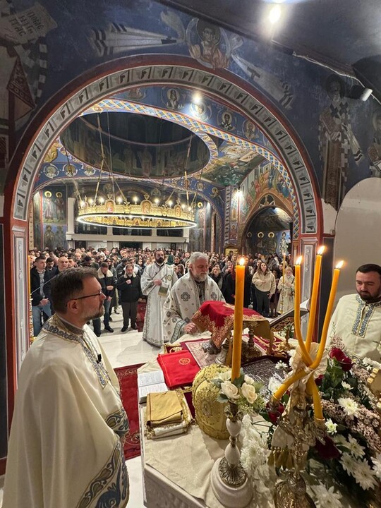 Dem Metropoliten konzelebrierten Erzpriester-Stavrophor Nebojša Rakić, Priester Aleksandar Sekulić und Hierodiakon Vasilije Starovlah. Der Gottesdienst fand in einer feierlichen und andächtigen Atmosphäre statt, und die Kirche war erfüllt vom freudigen Ostergruß: „Christus ist auferstanden!“ — „Wahrhaftig ist er auferstanden!“