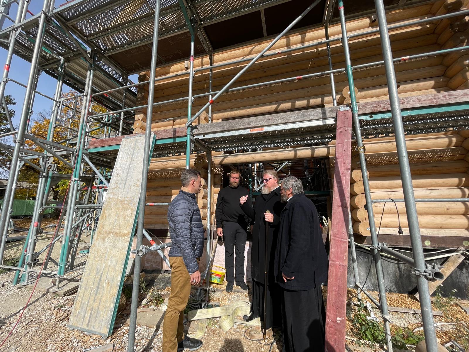 Anschließend informierte sich Erzbischof Tichon über den Fortschritt beim Kirchenbau. Derzeit errichtet die Gemeinde an der Knappertsbuschstraße ein hölzernes Gotteshaus mit rund 150 Quadratmetern Nutzfläche und einem 20 Meter hohen Glockenturm. Die Kirche entsteht vollständig in Spendenfinanzierung. Seit der Gründung 1996 feierte die Gemeinde ihre Liturgien lange in provisorischen Räumen. Inzwischen kommen regelmäßig mehrere hundert Menschen zu den Gottesdiensten, was den Wunsch nach einem würdigen Gotteshaus immer dringlicher machte.