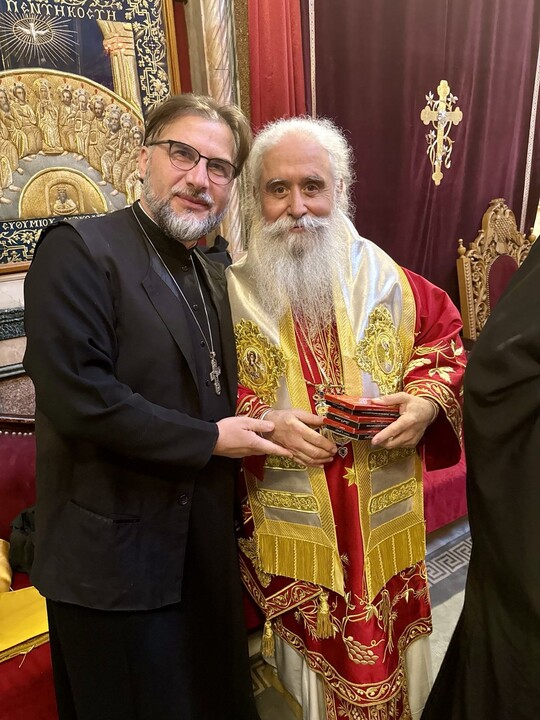 Nach dem Gottesdienst überbrachte Erzpriester Emilian Pochinok im Namen von Bischof Irenei von London die Glückwünsche und wünschte Erzbischof Simeon Kraft und Segen für seinen Dienst auf dem Berg Sinai. Zudem wurde die Pilgergruppe von Patriarch Theophilus III. empfangen.