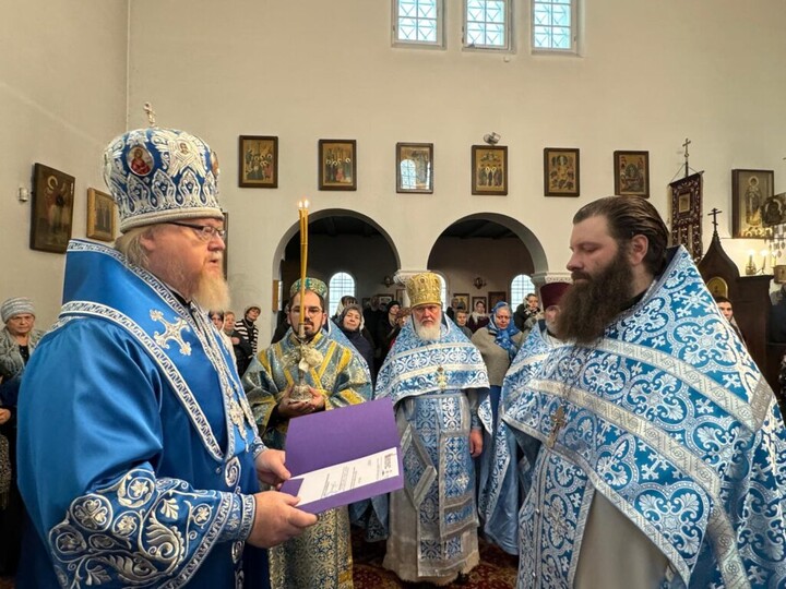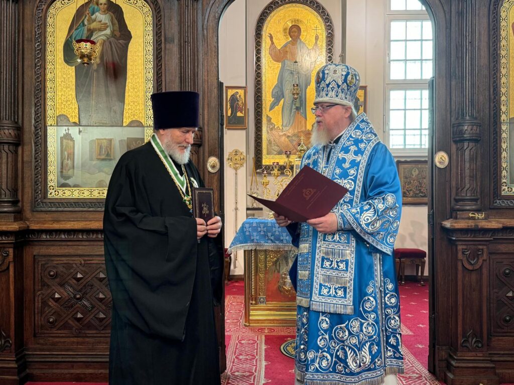 Nach der Liturgie sang der Klerus eine Festhymne, anschließend richtete Erzbischof Tichon eine Ansprache an die Gemeinde. Zum 70. Geburtstag von Erzpriester Sergei Iljin überreichte er ihm den Patriarchalorden des Heiligen Seraphim von Sarow (2. Klasse). Der Geehrte dankte für die Glückwünsche und die gemeinsame Feier. Traditionsgemäß reichte der neu geweihte Priester Andrej Guwa den Gläubigen das Kreuz zum Kuss.