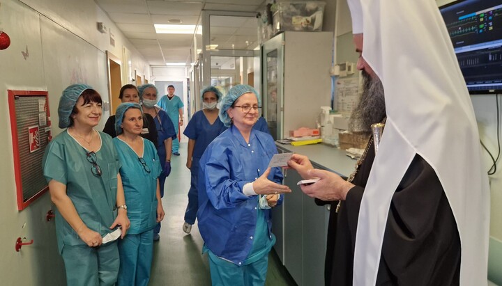 Darüber hinaus segnete der Patriarch die anwesenden Ärztinnen und Ärzte, Pflegekräfte sowie das medizinische Personal und überreichte allen Ikonen mit der Darstellung der Geburt Christi.