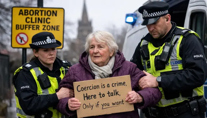 Am 22. Dezember 2025 erschien die Nachricht, dass eine 75 Jahre alte Frau in Schottland vor Gericht steht, weil sie sich in der Nähe einer Einrichtung für Schwangerschaftsabbrüche aufgehalten hat. Sie trug ein Schild, mit dem sie ihre Bereitschaft zu einem freiwilligen Gespräch signalisierte. Nach eigenen Angaben sprach sie niemanden an und äußerte sich nicht zum Thema Abtreibung. Dennoch wurde sie von der Polizei abgeführt und stundenlang festgehalten. Darüber berichtete Opposition24.