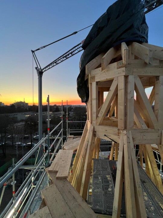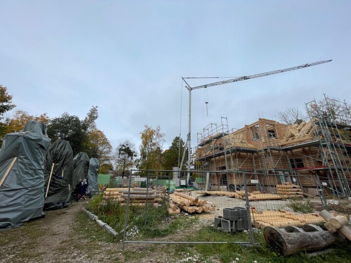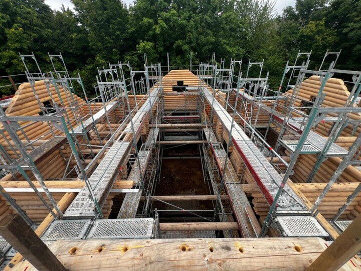 Anschließend wurde die Dachkonstruktion montiert. Derzeit wird eine erste Schutzschicht auf dem Dachstuhl angebracht, um das Gebäude während der Wintermonate vor Witterungseinflüssen zu schützen.