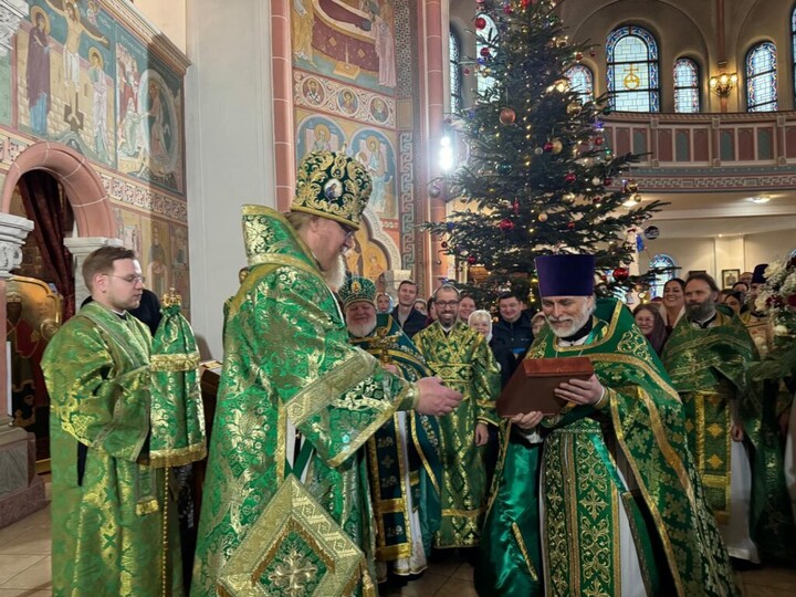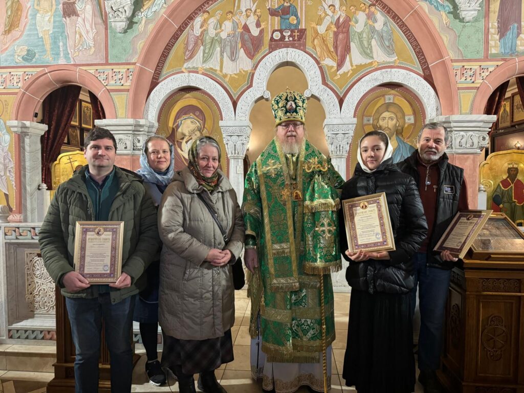 Am Ende der Liturgie wurde der hl. Johannes von Kronstadt feierlich gepriesen, und Erzbischof Tichon sprach ein Gebet zu ihm. Anschließend überreichte er bischöfliche Urkunden an Gemeindemitglieder. Der Rektor der Kirche, Erzpriester Sergij Baburin, dankte dem Erzbischof für den Gottesdienst und überreichte ihm eine Ikone des heiligen Tichon, Patriarch von ganz Russland, mit einem Reliquienfragment. Am Nachmittag weihte Erzbischof Tichon das neue Pfarrhaus auf dem Russischen Friedhof in Hamburg und dankte den Bauarbeitern bei einem persönlichen Gespräch.