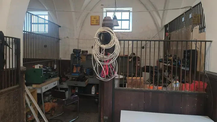 Im ehemaligen Pferdestall des Schlosses richteten die Brüder der russischen Auslandskirche eine provisorische Werkstatt ein. Dazu wurden die früheren Pferdeboxen geräumt und gereinigt, eine provisorische Heizung installiert und die Elektrik verbessert. Die Werkstatt dient bereits als zentrale Arbeitsstätte für die anstehenden Sanierungsarbeiten.