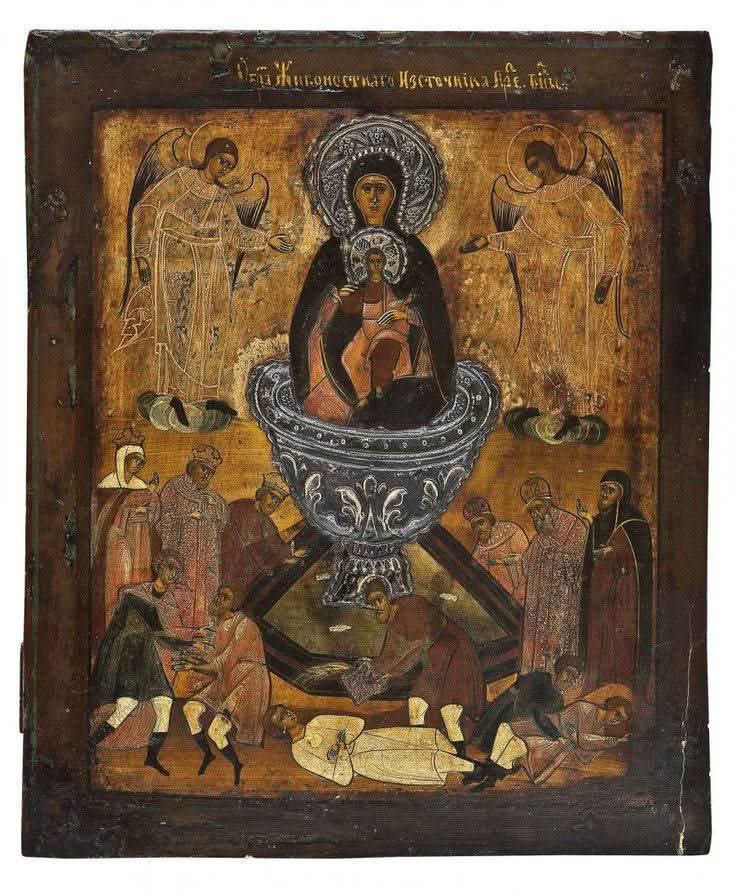 Die Ikone der „Lebensspendenden Quelle“ zeigt die Gottesmutter mit dem Christuskind über einer Quelle, aus der Wasser in reichem Strom fließt und von den Gläubigen als Zeichen göttlicher Gnade empfangen wird. Dieses Bild verweist auf die geistliche Erquickung und Heilung, die nach orthodoxem Verständnis durch Christus und seine Mutter vermittelt werden.